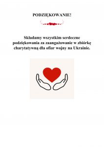 Składamy wszystkim serdeczne podziękowania za zaangażowanie w zbiórkę charytatywną dla ofiar wojny na Ukrainie.
