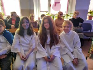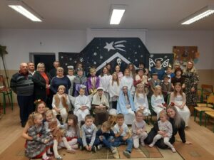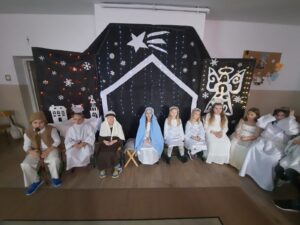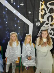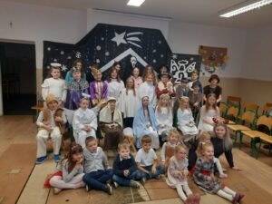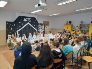 Ostatni grudniowy dzień przed przerwą świąteczna upłynął nam w wyjątkowej, nastrojowej atmosferze. Dzień zaczęliśmy od spotkania, które przypomniało nam tradycyjne polskie zwyczaje bożonarodzeniowe. Mogliśmy także poznać kilka ciekawych informacji na temat zwyczajów świątecznych w Meksyku, Argentynie, Wielkiej Brytanii, Islandii i kilku innych krajach. Wspólnie wzięliśmy udział w zabawach i konkursach świątecznych. Zwieńczeniem, i jednocześnie najważniejszą częścią tego dnia był występ jasełkowy przygotowany przez wszystkie klasy, a jego dopełnieniem- przepiękny koncert kolęd, zatytułowany „Kolędujmy Jezuskowi”. Jak co roku podczas występu towarzyszył nam ksiądz proboszcz Kazimierz Kłapkowski. Razem z Panią Dyrektor złożyli wszystkim świąteczne życzenia i zgodnie z tradycją symbolicznie przełamaliśmy się opłatkiem.
