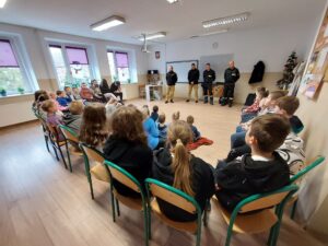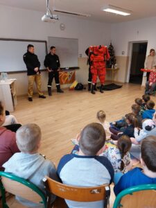 Bezpieczne ferie. Spotkanie ze strażakami z PSP w Głuchołazach. Pogadanka nt. bezpieczeństwa podczas ferii zimowych.